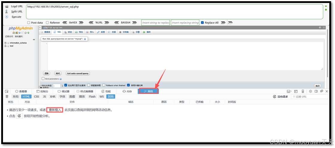 点击重新载入或者刷新页面,进入到如下页面,点击当前报文index.php,在页面底部的右方点击cookies。在cookie中获取到phpmyadmin值3c1b4424c30833f7ecfeee09b9c8a9bb。
