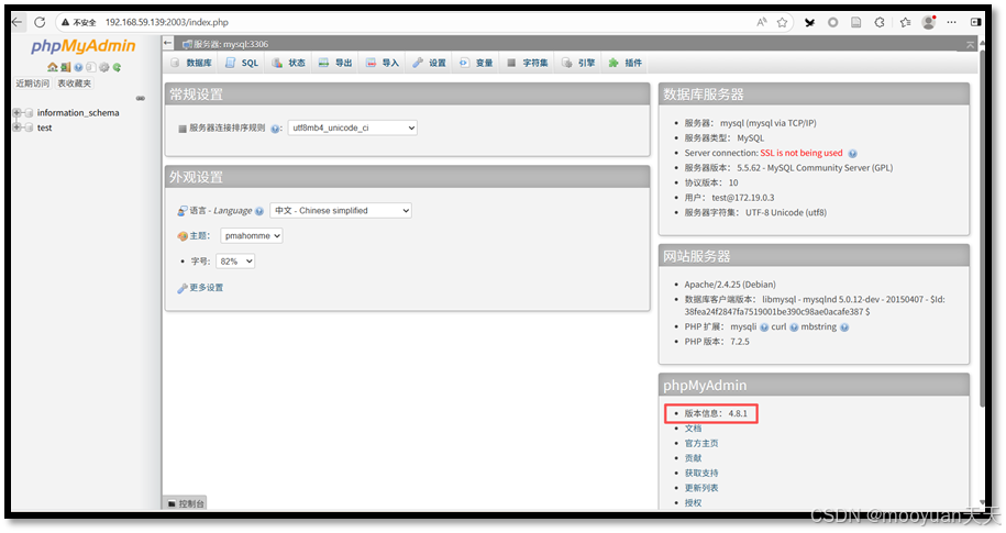 再次访问http://192.168.59.139:2003 如下所示,这次成功了,且发现phpmyadmin版本为4.8.1。