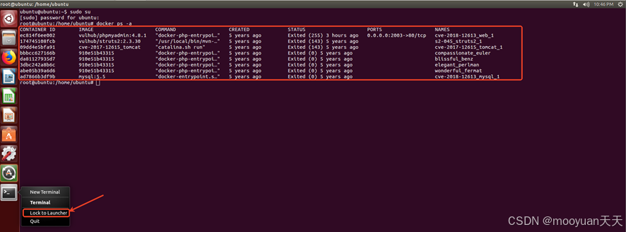 首先输入sudo su进入特权模式,然后使用docker ps -a查看所有容器,如下图红框所示。为了方便使用,可以右键将其固定到任务栏中,如下所示。