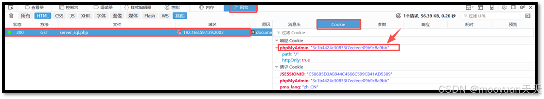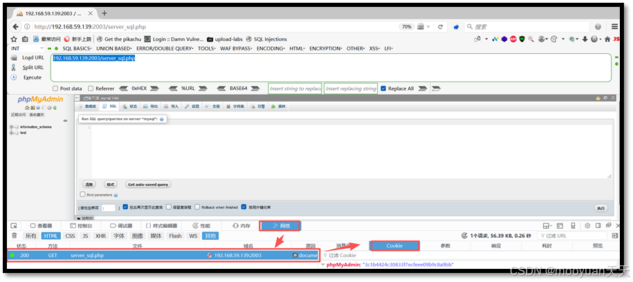 访问目标URL http://192.168.59.139:2003/server_sql.php,查看Cookie值。
