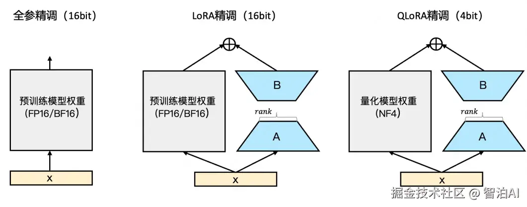 在原始的权重矩阵(记为(W))旁边,加两个小矩阵(A)和(B); (A)和(B)的"秩"(rank)很低(比如8或16),参数量远小于(W); 微调时,原始矩阵(W)不动,只更新(A)和(B)。