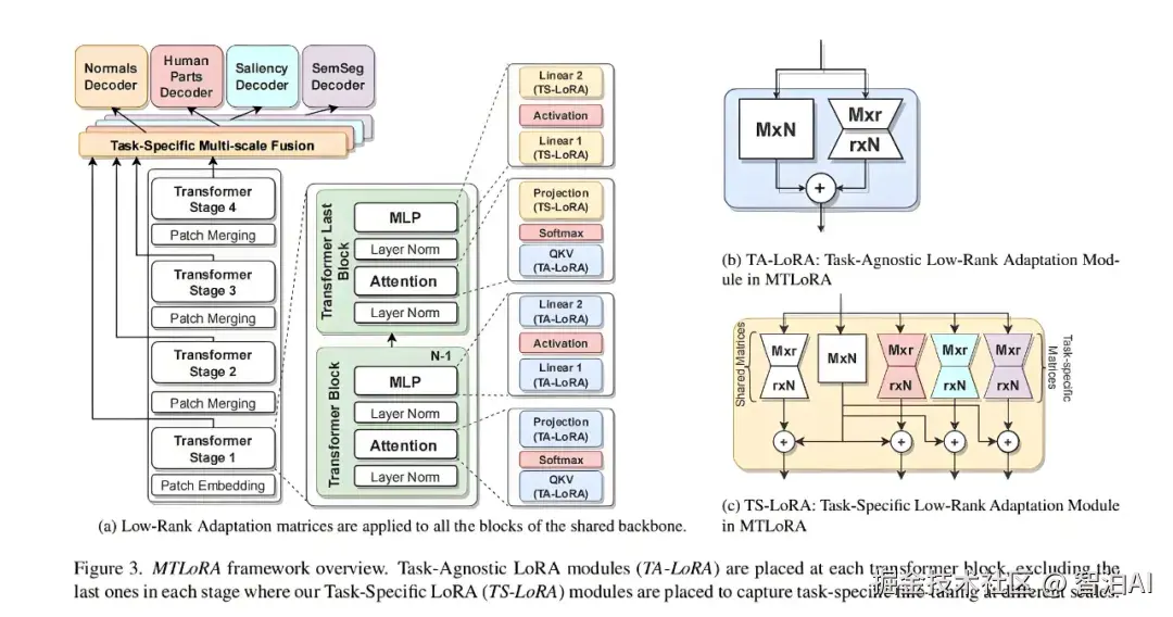多任务学习:一个基础模型,通过不同 LoRA 模块处理不同任务,比如翻译、对话、文本生成。