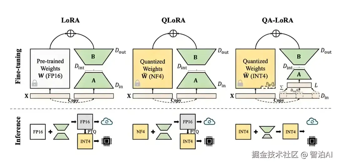 2.加 LoRA 模块: 在模型的某些层(比如自注意力层)旁边加两个小矩阵(A)和(B)。