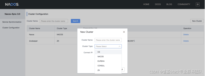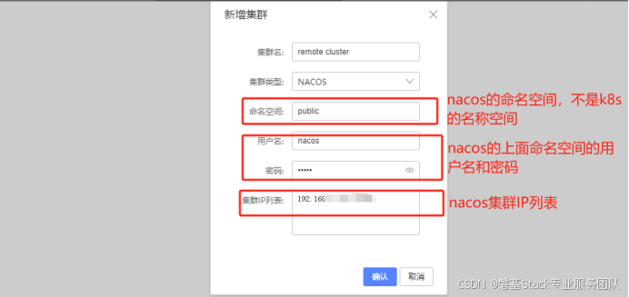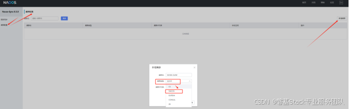 打开控制台的"集群配置"-->"新增集群"出现下面界面,填写集群名字,集群类型如NACOS集群,填写集群地址,如果是k8s部署的集群,填写svc暴露的nodePort即可