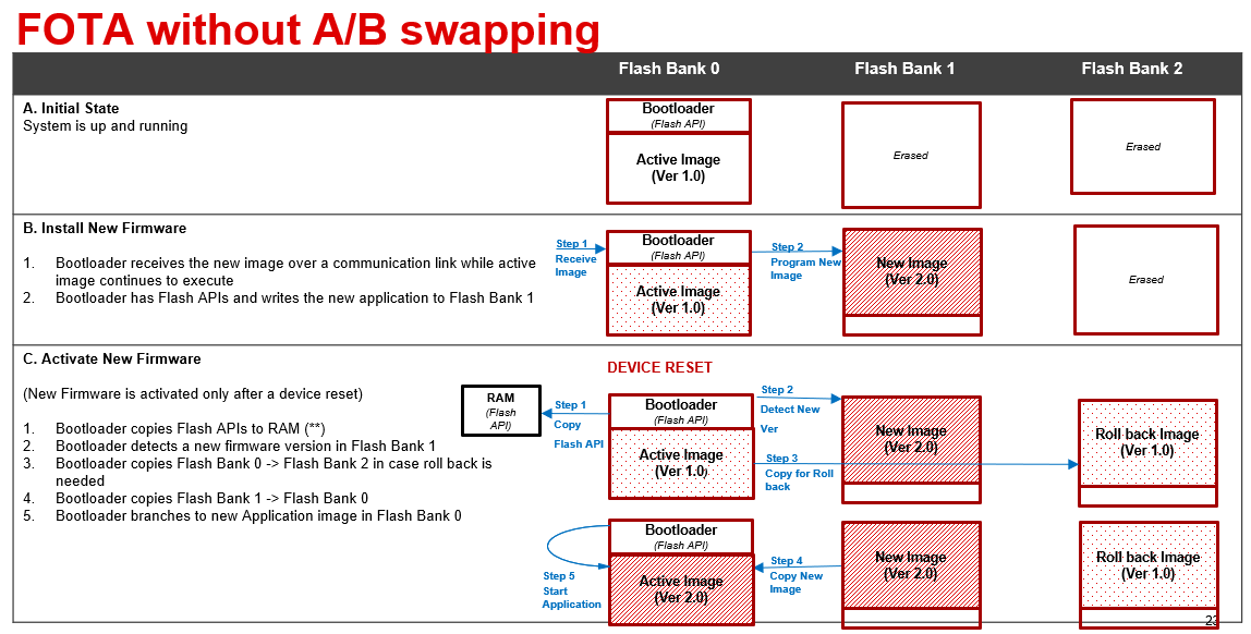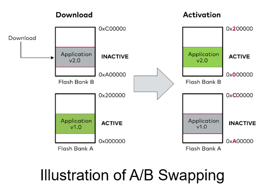 - 更新区(Inactive Bank):接收并烧写新固件,不影响运行区;