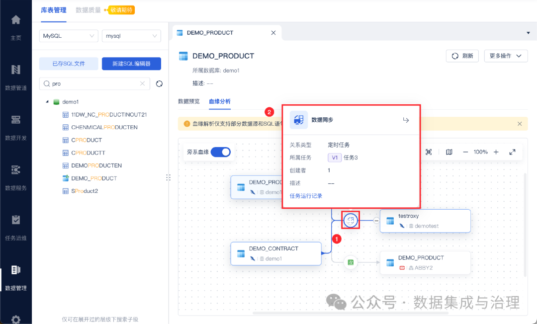 它在执行数据同步和转换任务的同时,就能自动地、实时地构建字段级别的数据血缘 ,并且提供了非常清晰的可视化界面。这为我们省去了大量手动录入和解析SQL的繁琐工作,让团队能更专注于血缘的应用本身。说实话,这种开箱即用的体验,对很多数据处理人员非常友好。