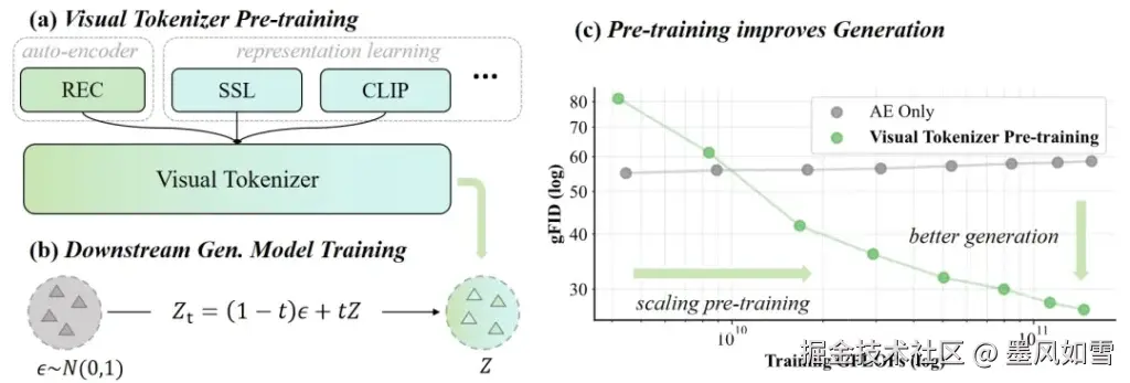 为了理解VTP的突破,我们得先聊聊现在的视觉模型是怎么工作的。通常,我们用一个Tokenizer(比如VAE)把图片压缩成Latent(潜在表示),然后让生成模型去学习这个Latent。