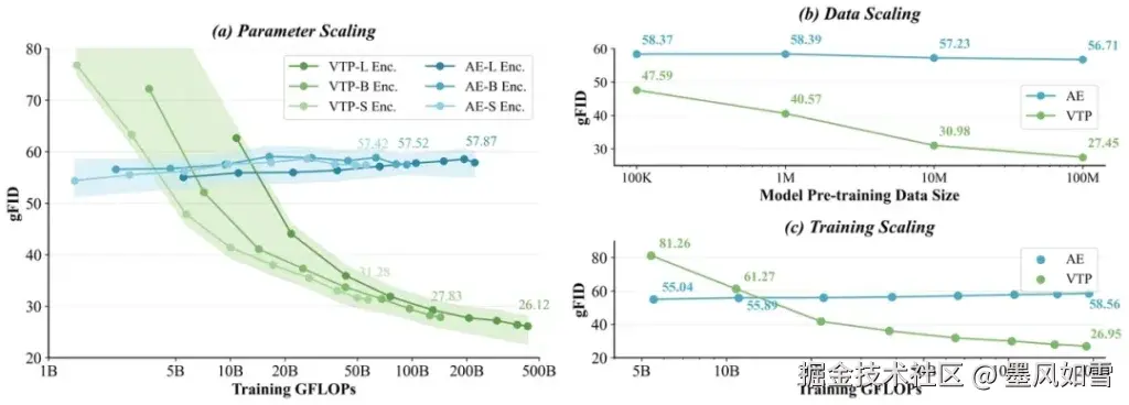 根据MiniMax公布的实验数据,当你增加VTP的参数量、训练数据和计算量时,下游的生成模型性能呈现出一条漂亮的上升曲线。