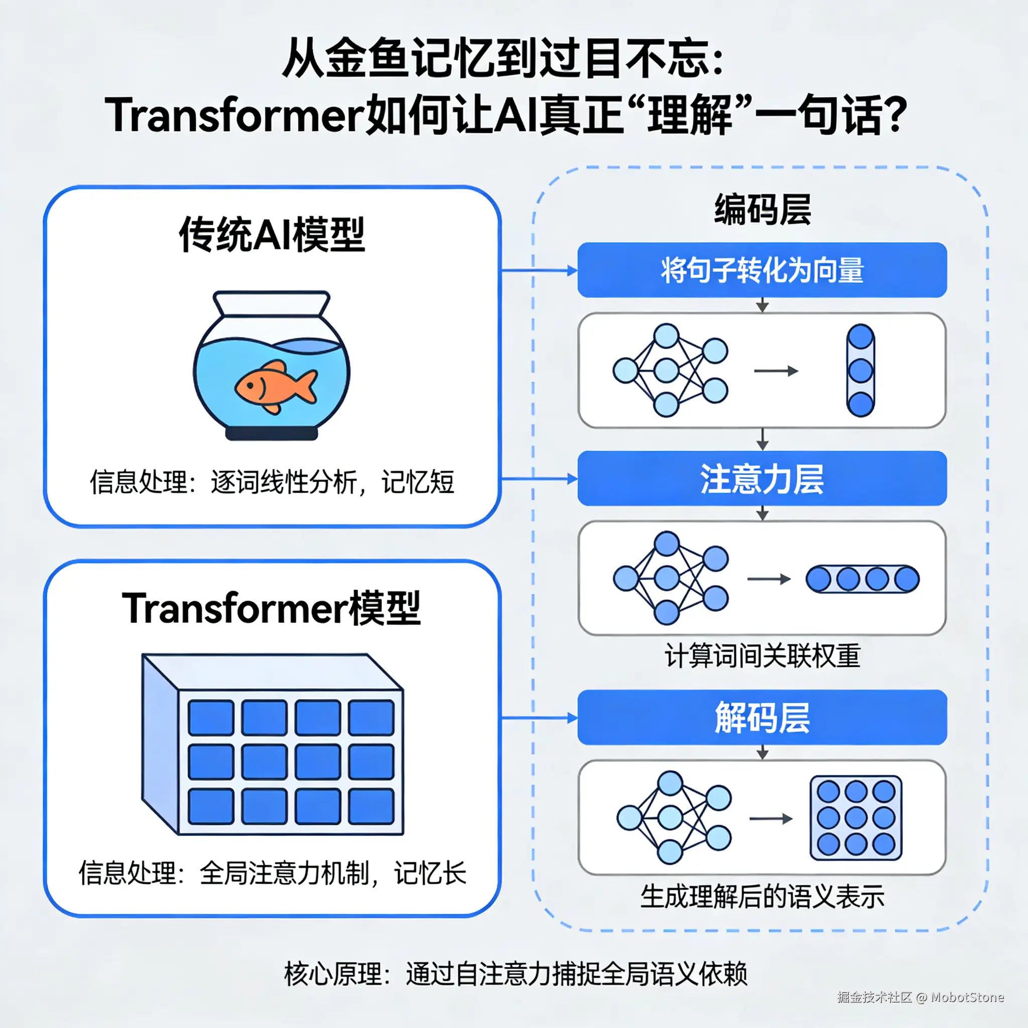 这都得归功于2017年,Google团队发表的一篇名为《Attention Is All You Need》的论文,彻底改变了人工智能的历史进程。在此之前,AI处理长文本如同"即使只有7秒记忆的金鱼",而Transformer的出现赋予了机器"过目不忘"的能力。今天我们来理解语言模型如何实现智能表现!