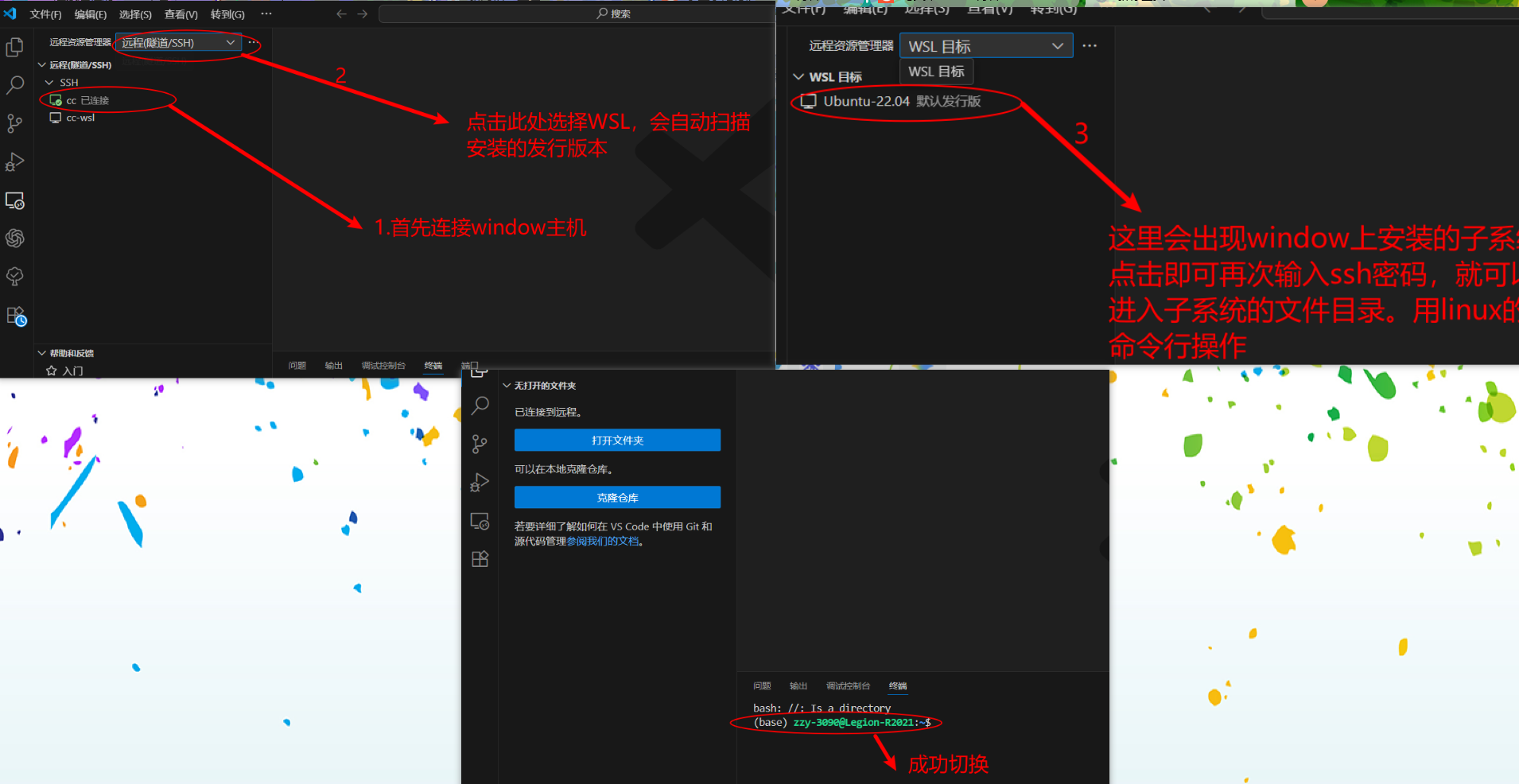 首先在扩展中安装remote-ssh,WSL的插件。SSH按照教程配置好,WSL插件能够自动扫描SSH目标主机和本地主机的子系统。