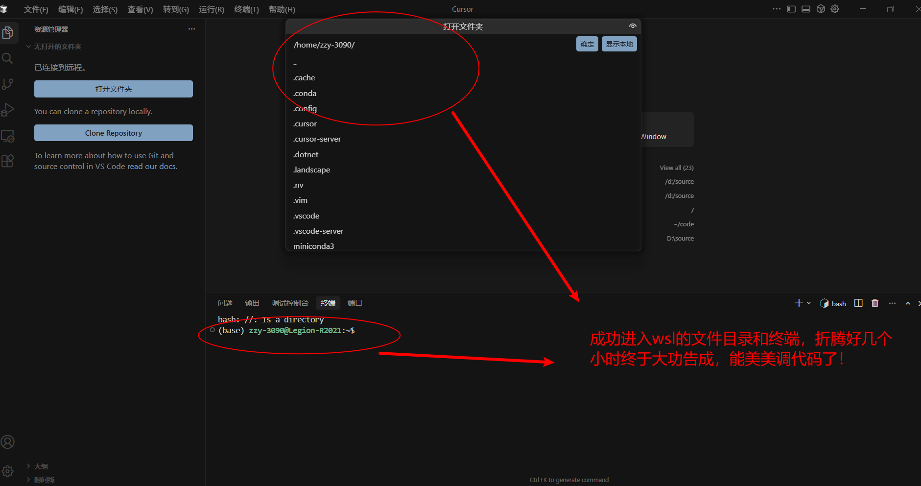 cursor使用SSH连接远程window主机,无法切换WSL子系统。