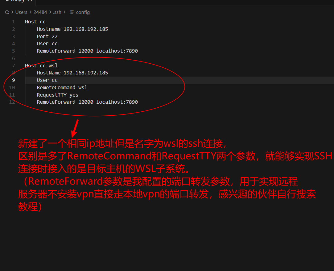 - 使用提示词 "cursor 怎么用SSH连接远程服务器192.168.192.185(window主机),连接的是他的WSL " 询问gemini,给出如下解决方法,直接修改ssh config配置文件添加RemoteCommand和RequestTTY两个关键参数,如下图所示: