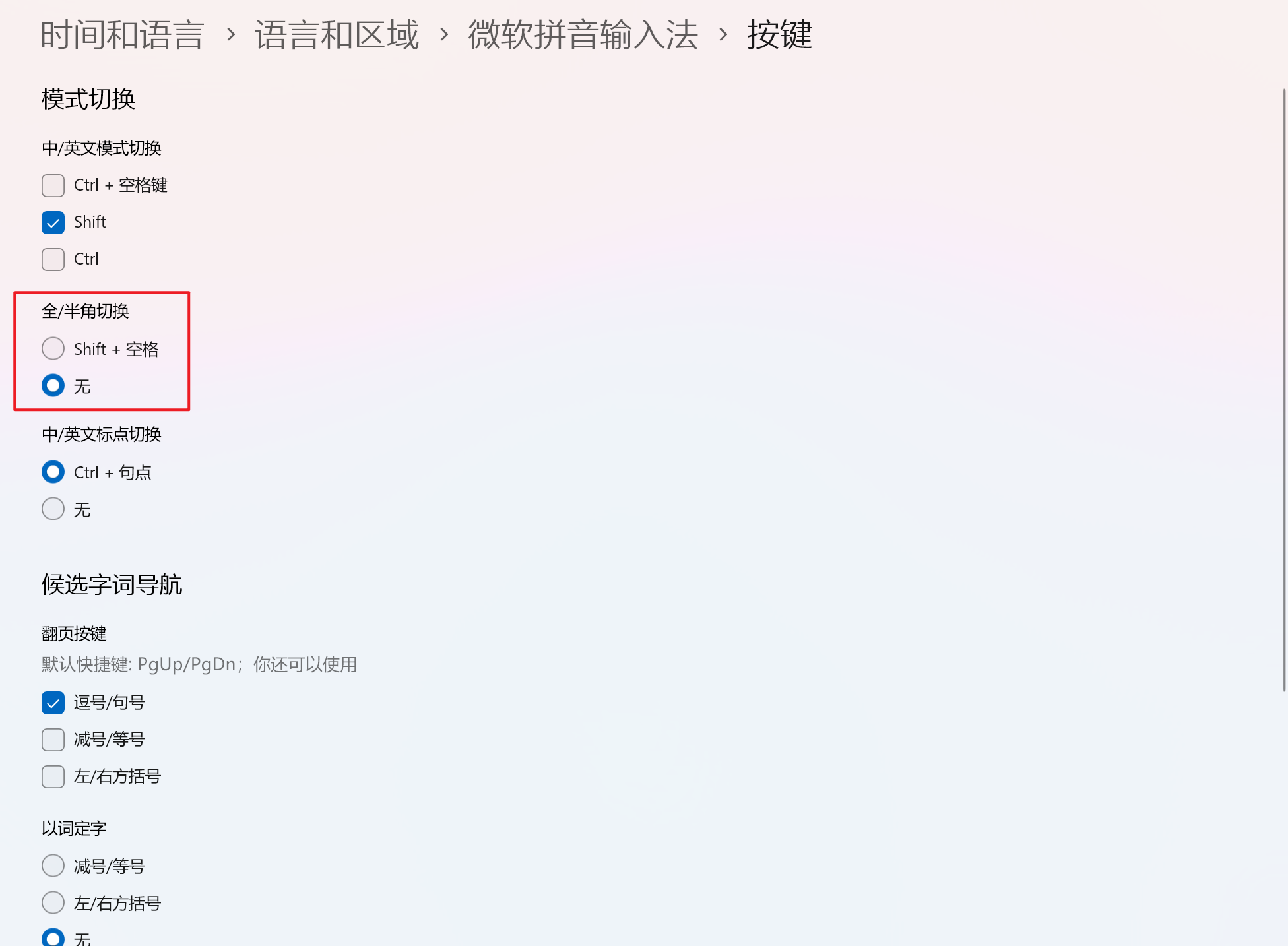 在 Win10 上,微软输入法可以使用 shift + 空格 进行切换 半角/全角 的输入,同时微软输入法提供了禁用此切换的功能,在 微软拼音输入法设置 > 按键 > 全/半角切换,将其设置成 无 即可。