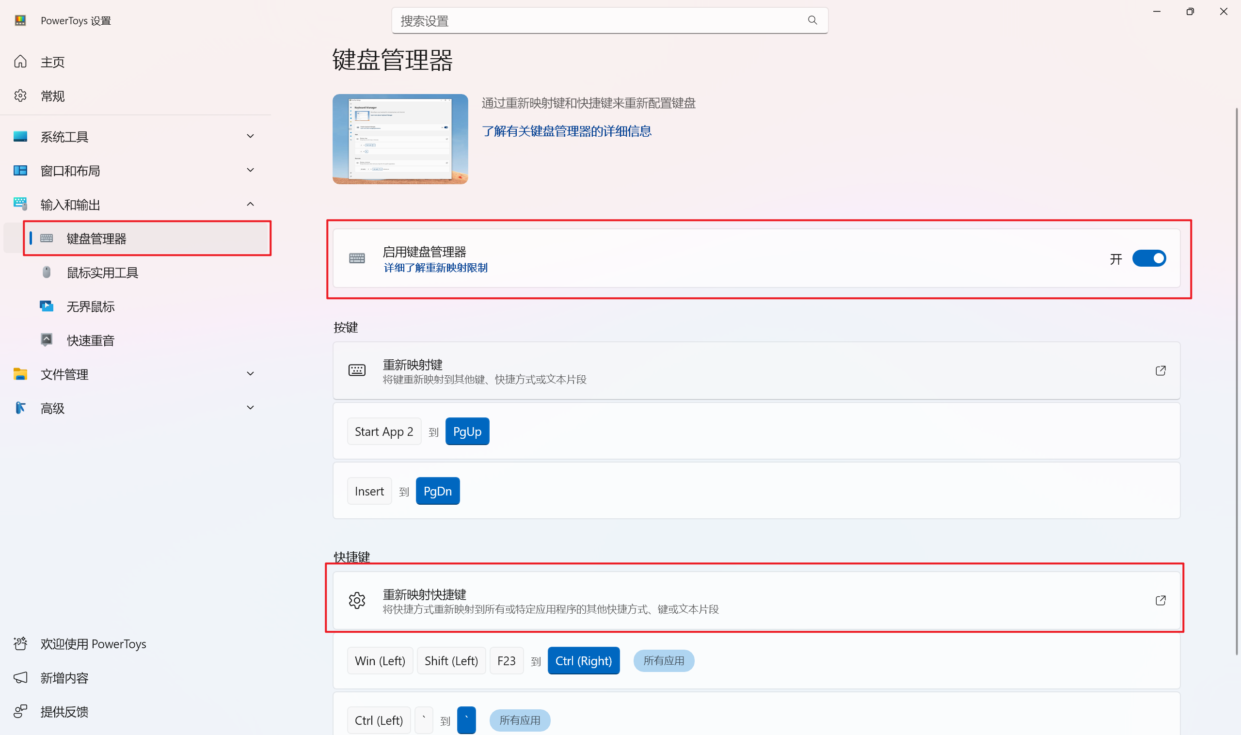 在 PowerToys > 输入和输出 > 键盘管理器 页面中,首先 启用键盘管理器,然后再 重新映射快捷键: