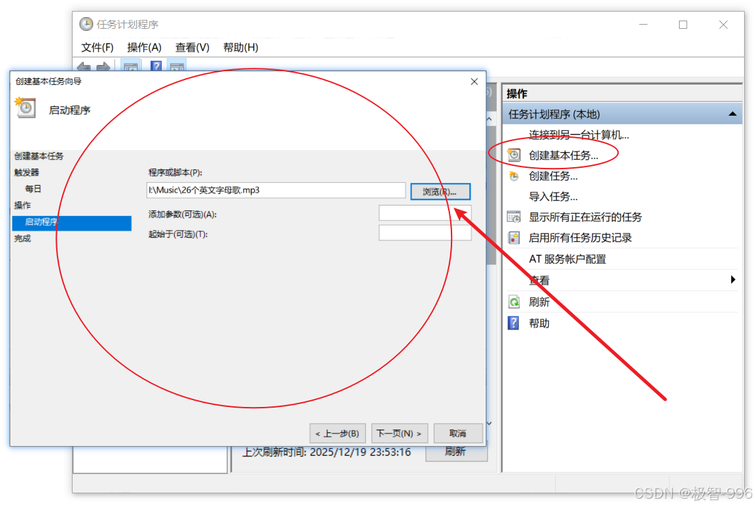 选择 "启动程序",点击 "下一步",在 "程序或脚本" 里点击 "浏览",选择要播放的音乐文件(支持 MP3、WAV 格式);