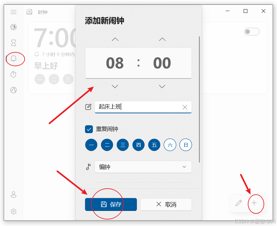 点击应用左侧 "闹钟" 选项卡,再点击右上角**"+" 号**,新建闹钟;
