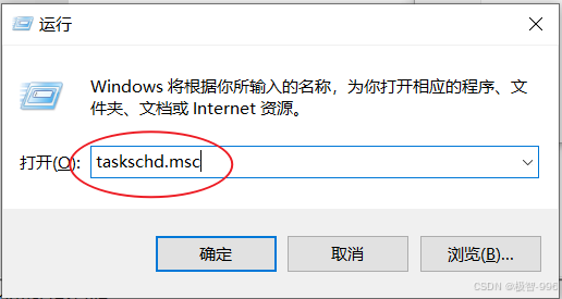 按下快捷键 "Win+R",输入**"taskschd.msc"**,点击 "确定" 打开;