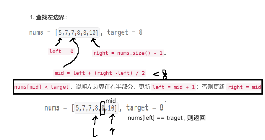 nums[mid] < target,说明左边界在右半部分,更新left = mid + 1;否则更新right = mid。 - 循环结束后,检查