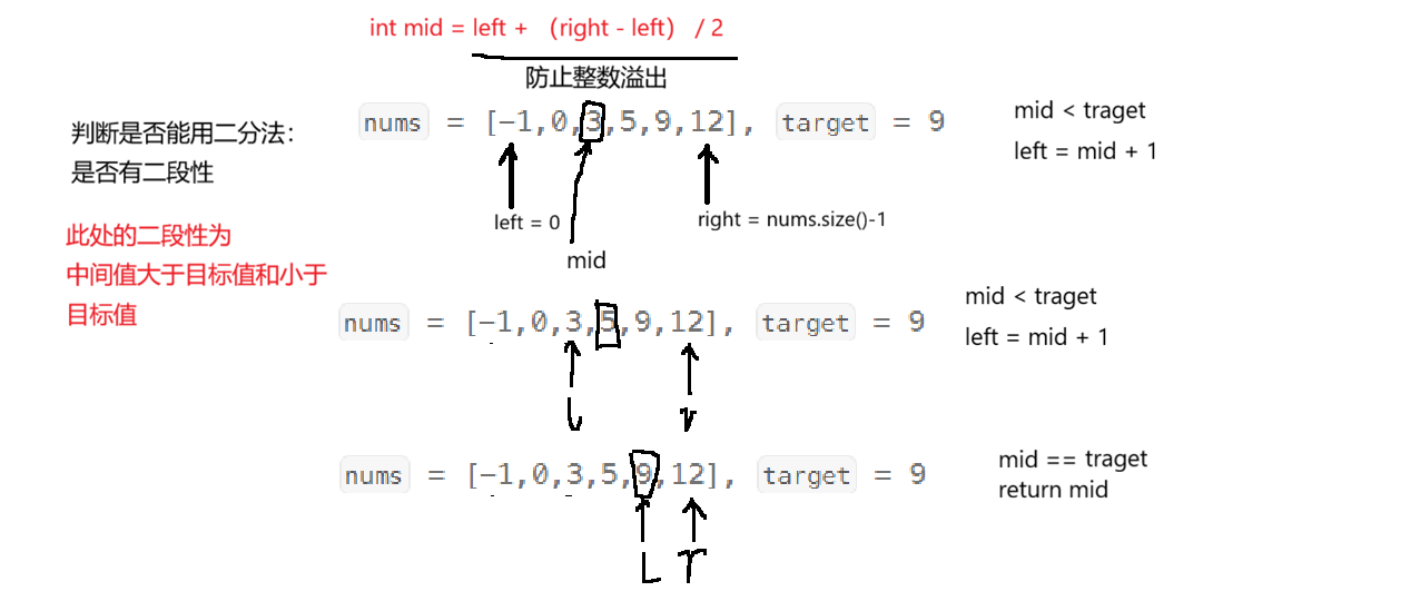 left <= right的条件下,计算中间位置mid,计算公式为mid = left + (right - left) / 2,该写法可避免left + right导致的整数溢出。 - 比较