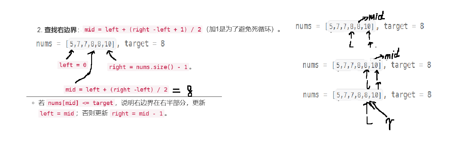 nums[mid] <= target,说明右边界在右半部分,更新left = mid;否则更新right = mid - 1。
