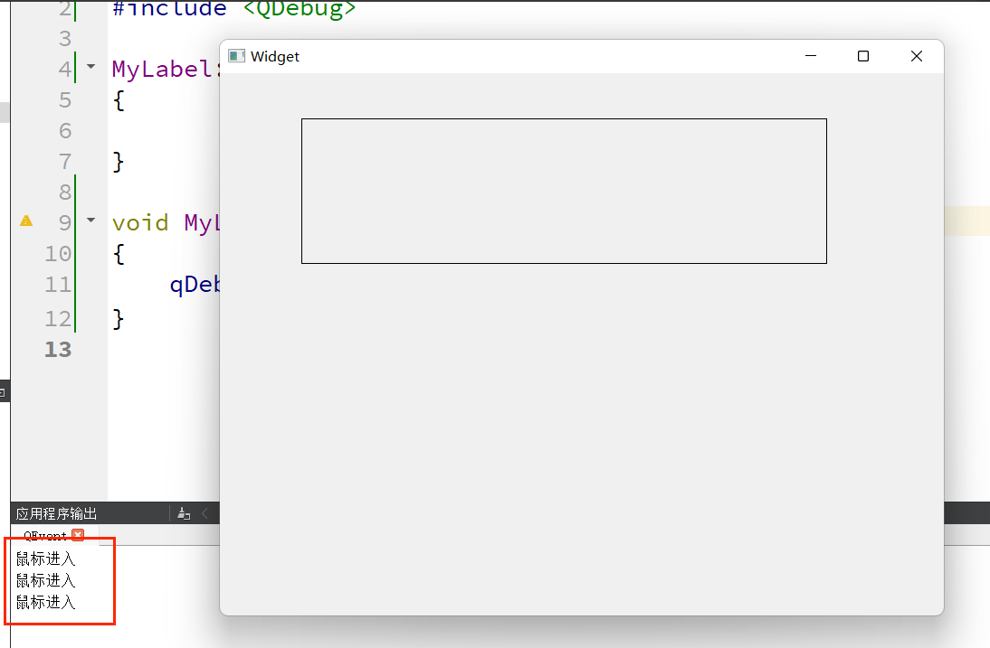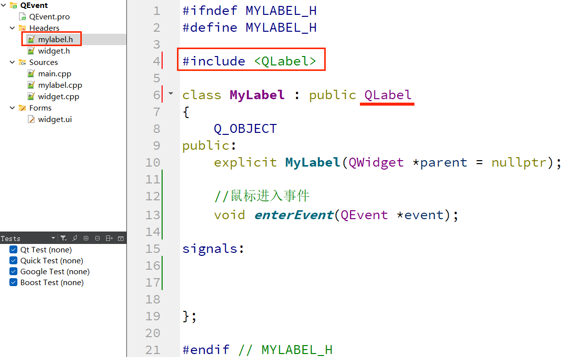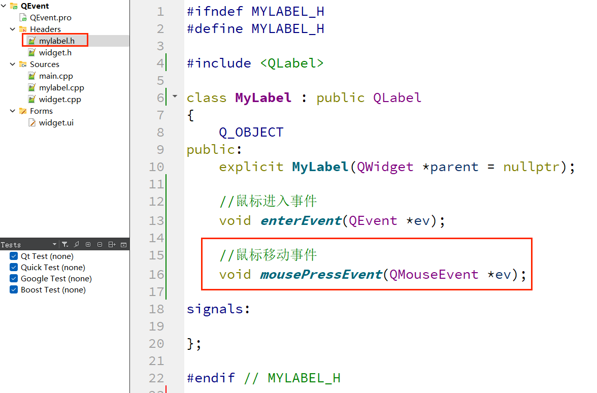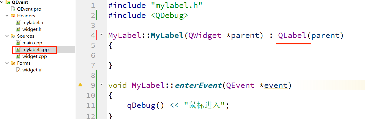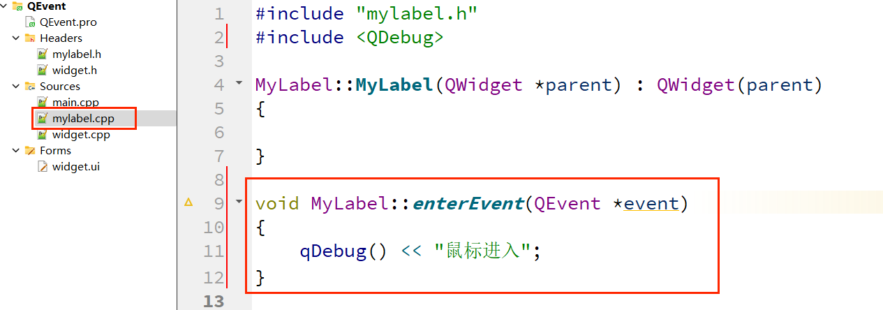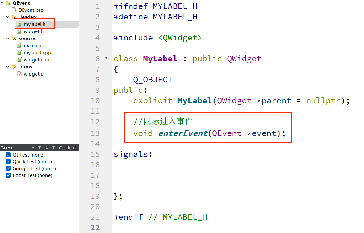 8、复制 enterEvent() ,粘贴在项目文件 "mylabel.h" 中;