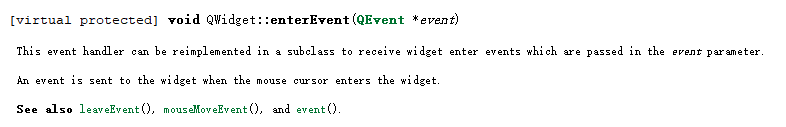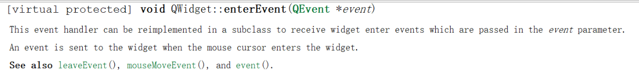 在 Qt 中,几乎所有的 Event 函数都是虚函数,所以可以重新实现。如:在实现鼠标的进入和离开事件时,直接重新实现 enterEvent() 和 leaveEvent() 即可。enterEvent() 和 leaveEvent() 函数原型如下: