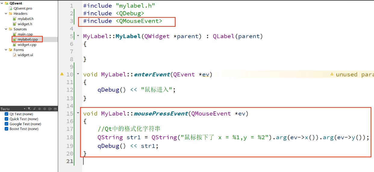 2、在 mylabel.cpp 中重写 mousePressEvent() 方法;