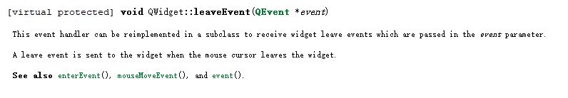 virtual protected\] void QWidget::leaveEvent(QEvent \*event) This event handler can be reimplemented in a subclass to receive widget leave events which are passed in the event parameter. A leave event is sent to the widget when the mouse cursor leaves the widget. See also enterEvent(), mouseMoveEvent(), and event().
