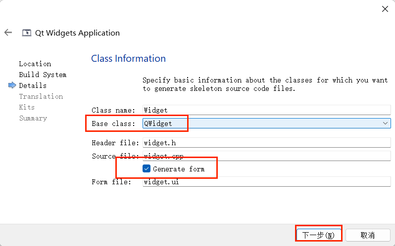 1、新建 Qt 项目,基类选择 QWidget,同时勾选 UI 界面文件,如下图示;