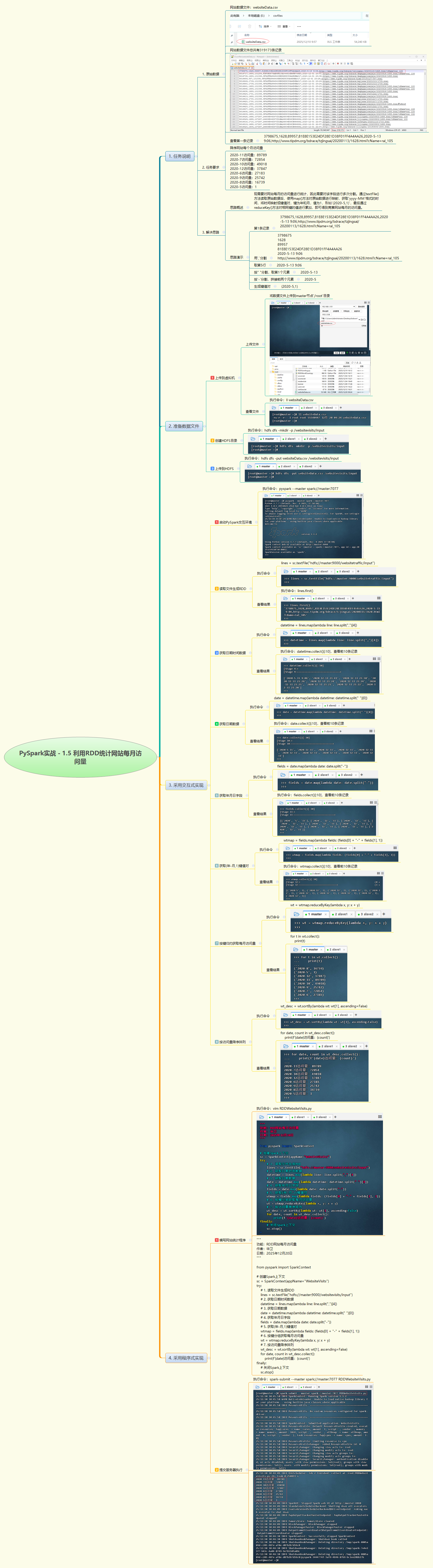 - 本次实战利用 PySpark RDD 对网站访问日志进行分析,提取每条记录中的访问时间字段,解析出"年-月"作为键,通过