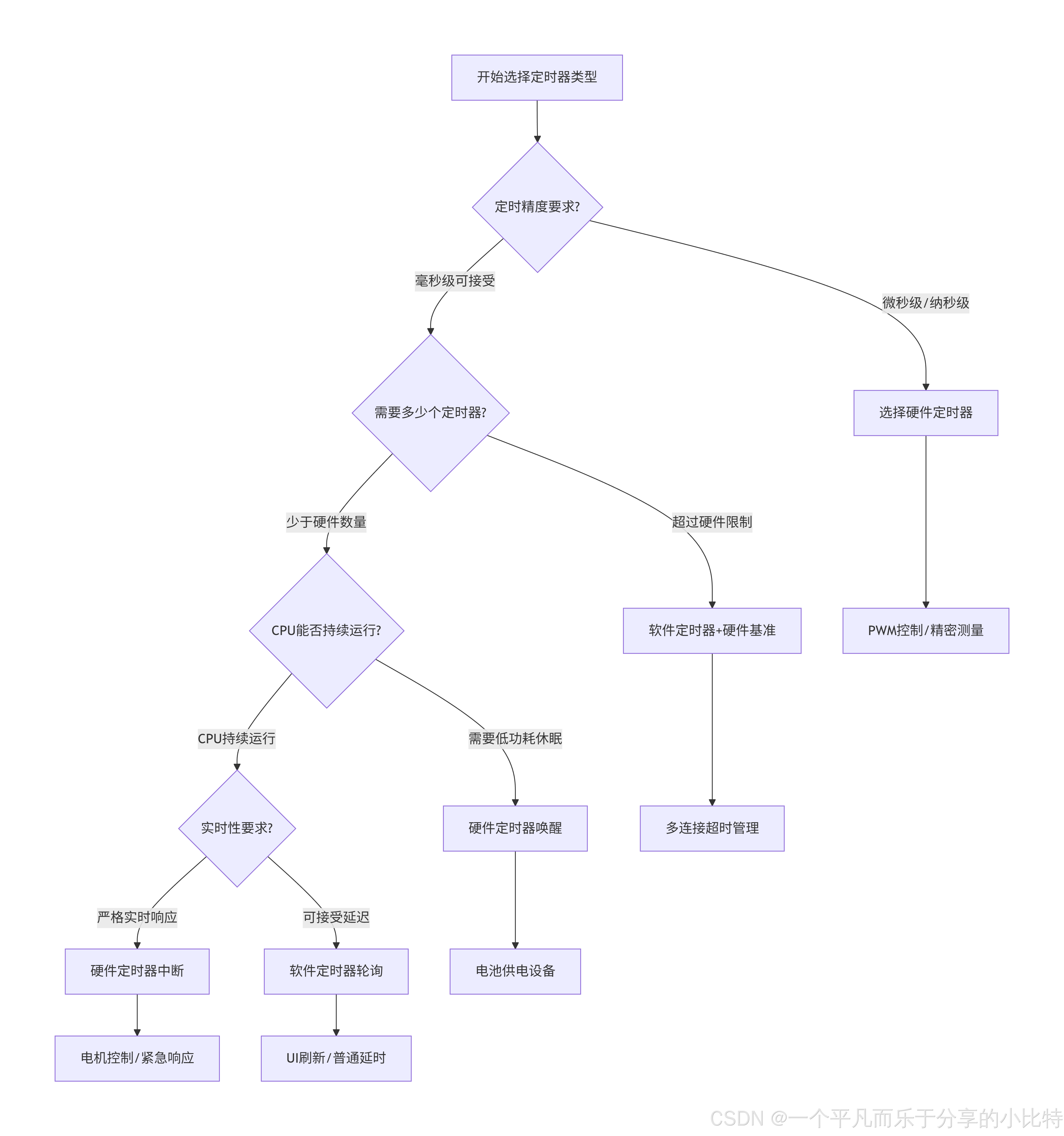 硬件定时器是做"硬"事的专家------精确、可靠、独立;软件定时器是管"软"事的多面手------灵活、数量多、易用。实际项目中,它们通常是搭档而非对手,共同构建稳健的时间管理系统。