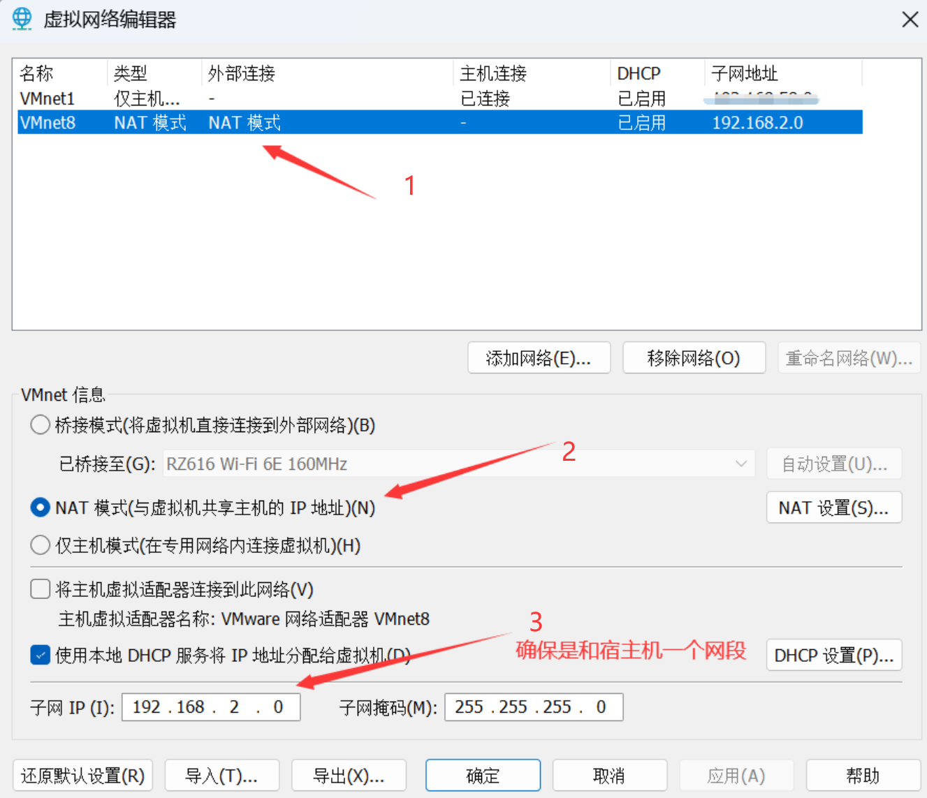 编辑->虚拟网络编辑器,确保是和宿主机一个网段