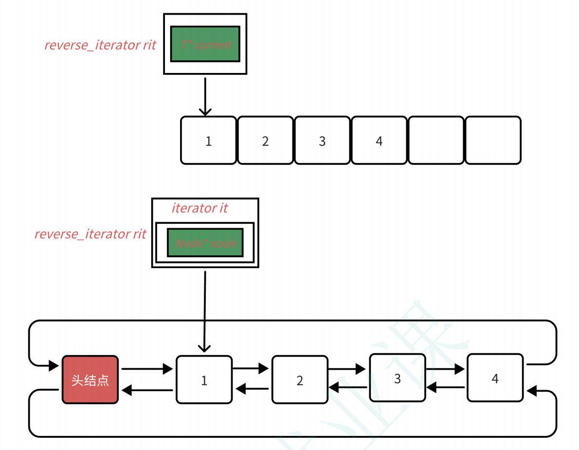 反向迭代器本质是一个适配器,使用模版实现,传递哪个容器的迭代器就可以封装适配出对应的反向迭代器。因为反向迭代器的功能跟正向迭代器功能高度相似,只是遍历的方向相反,类似operator++底层调用迭代器的operator--等,所以封装一下就可以实现。