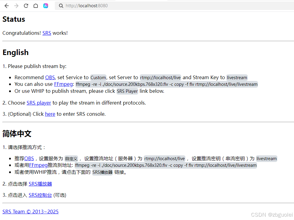 SRS是一个开源的(MIT协议)简单高效的实时视频服务器,支持RTMP、WebRTC、HLS、HTTP-FLV、SRT、MPEG-DASH和GB28181等协议。