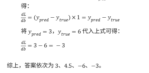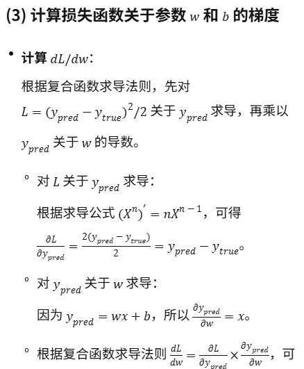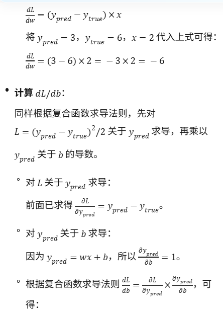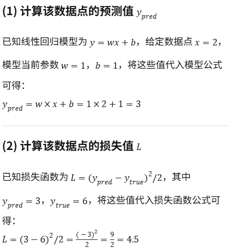 假设有一个简单的线性回归模型 y = wx + b,其中 w 和 b 是模型参数。我们使用均方误差(MSE)作为损失函数 L = (y_pred - y_true)^2 / 2。给定一个数据点 (x=2, y_true=6),模型当前的参数为 w=1, b=1。 请计算: (1)该数据点的预测值 y_pred。 (2)该数据点的损失值 L。 (3)根据均方误差的梯度公式,计算损失函数关于参数 w 和 b 的梯度(即 dL/dw 和 dL/db)?