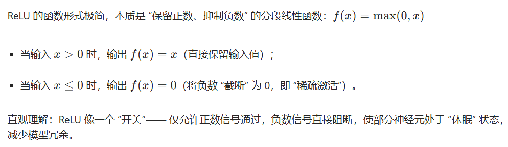 ReLU(Rectified Linear Unit,修正线性单元)是深度学习中最常用的激活函数之一,核心作用是为神经网络引入非线性,同时解决传统激活函数(如 sigmoid、tanh)的梯度消失问题,广泛应用于 CNN、DNN、Transformer 等模型的隐藏层。