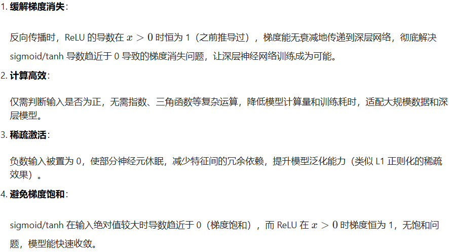深层网络易因参数过多过拟合,ReLU 的稀疏激活(部分神经元休眠)能减少特征冗余,提升模型泛化能力;而 Sigmoid 所有神经元均激活,易学习到训练数据的噪声。