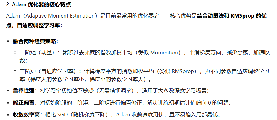 损失函数:nn.CrossEntropyLoss() 是多分类任务的标准损失,自动计算预测得分与真实标签的交叉熵,无需手动添加 Softmax(PyTorch 内置优化)。