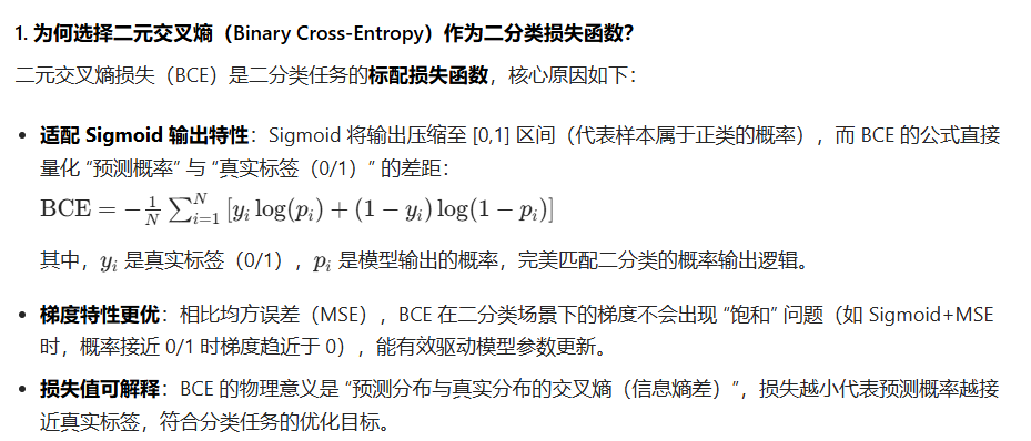 # 注:PyTorch的BCELoss要求输入是sigmoid后的概率值,与标签(0/1)计算损失