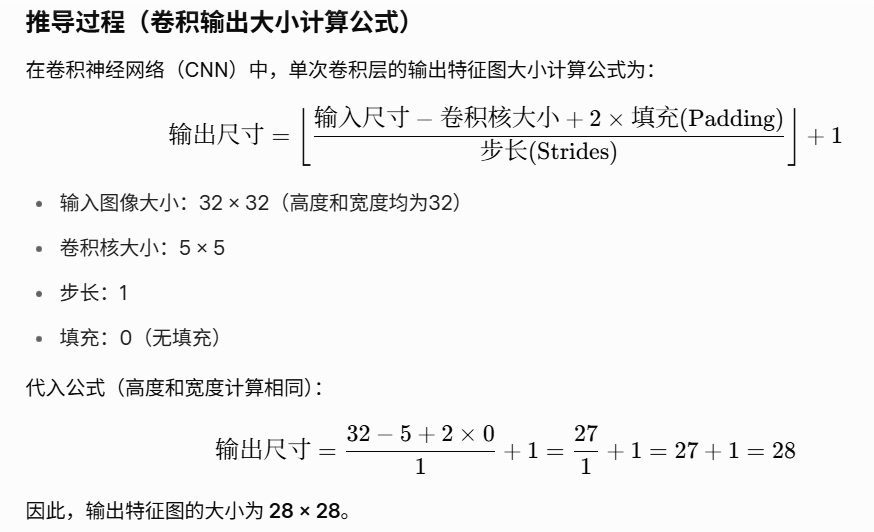 在卷积神经网络中,假设输入图像大小为 32 X 32,使用 5 X 5的卷积核,步长()为1,无填充(Padding=0),则输出特征图的大小为?