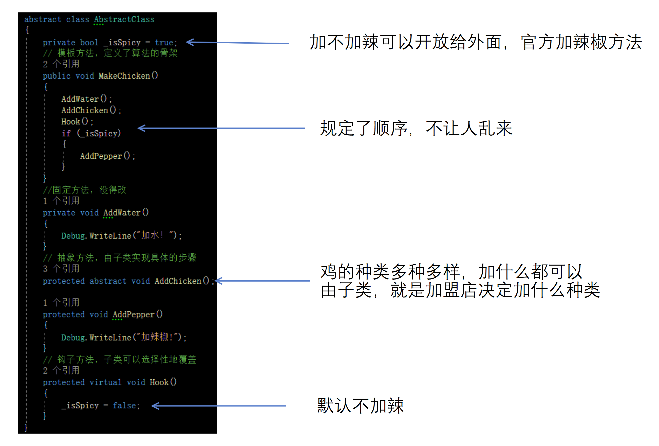 开放封闭原则(OCP):可以通过创建新的具体子类来扩展算法的步骤,但是如果要修改算法顺序,就得改抽象类。