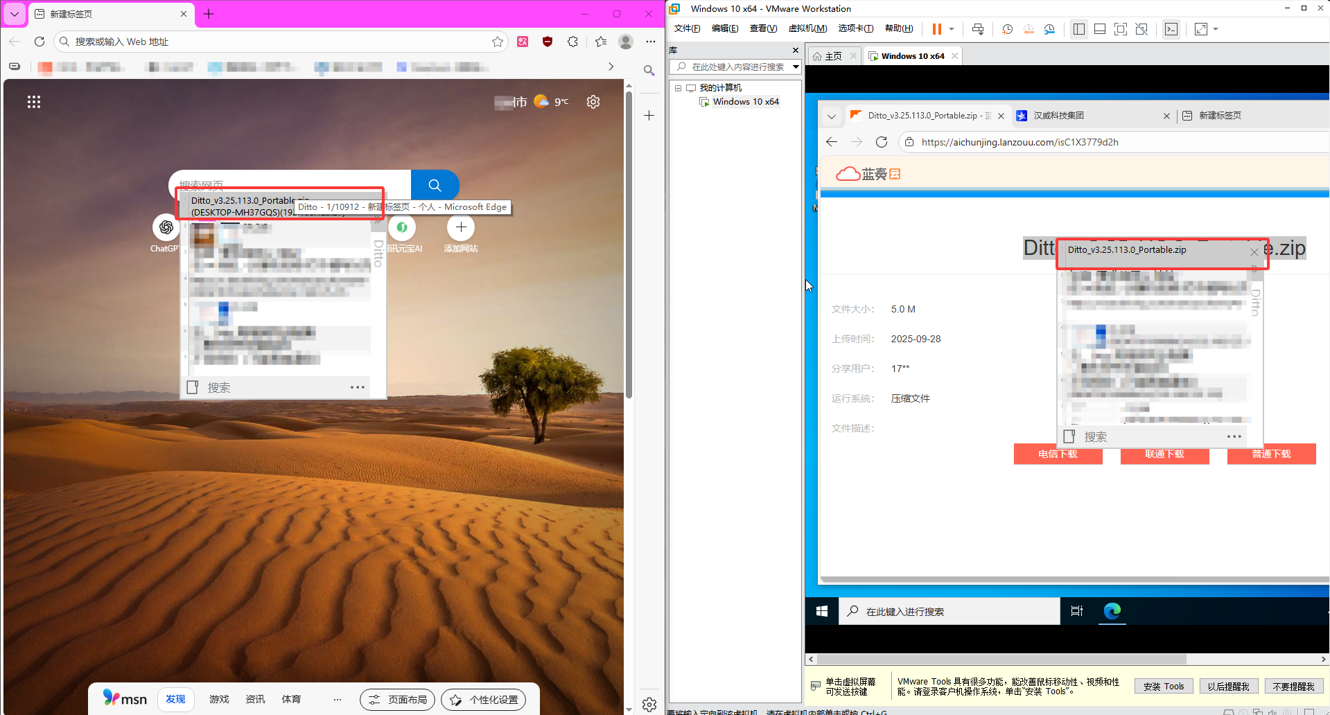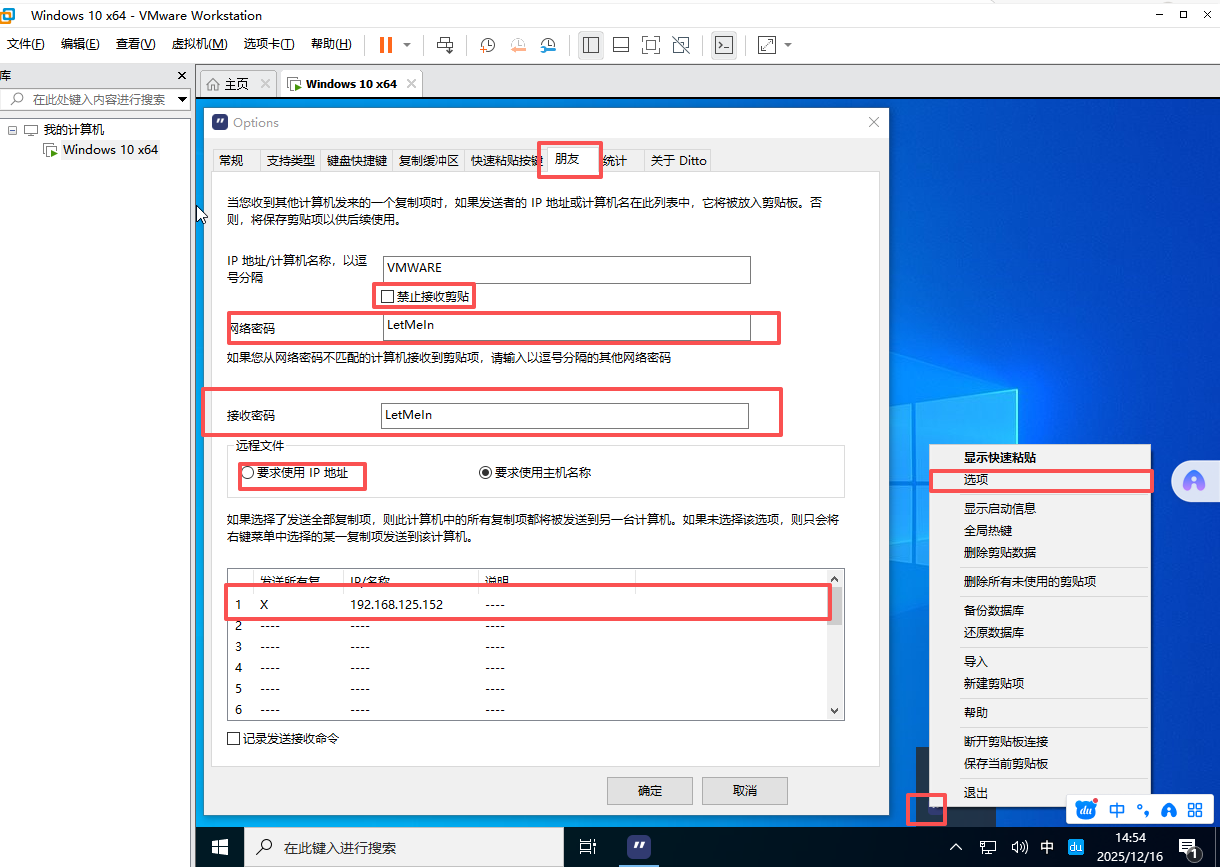 虽然 VMware 提供了自带的"剪贴板共享"功能,但在部分场景下(如多虚拟机、权限受限环境或稳定性要求较高时)存在局限。因此,本文采用 Ditto 剪贴板管理工具 ,利用其 局域网同步功能 ,实现宿主机与 VMware 虚拟机之间稳定、高效的复制粘贴共享。
