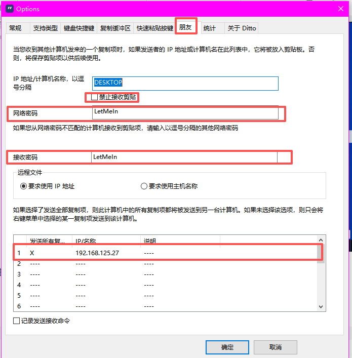 在宿主机和虚拟机中分别打开 Ditto,进入 Options → Network(或"朋友") 页面,完成设置。