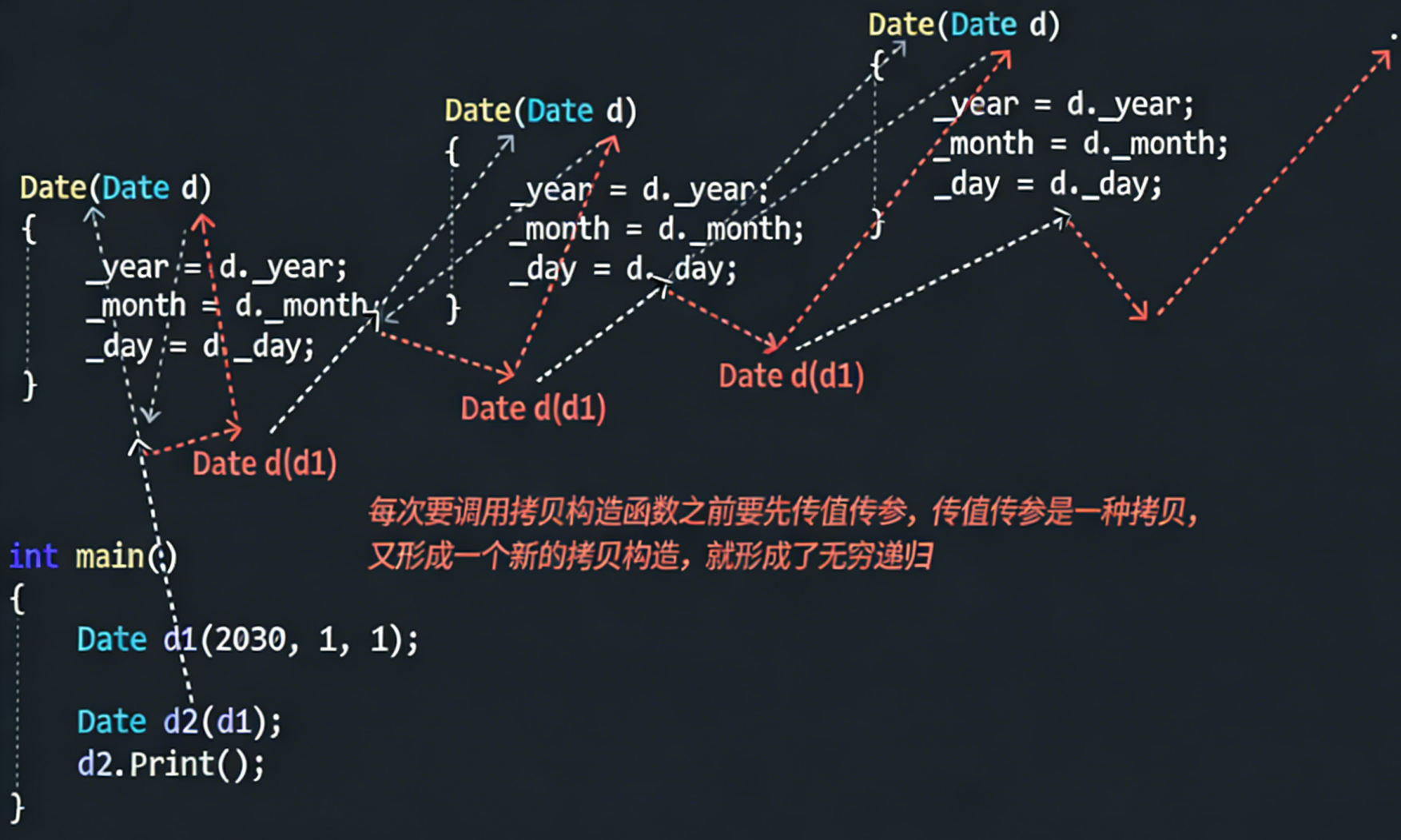 所以如果我们的拷贝构造使用传值传参,就会出现每次传值过来,都会再次调用拷贝构造,无穷递归
