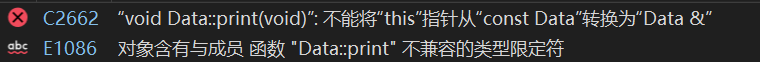 就会报错,根本原因是,我们在调用成员函数的时候,会把对象传递给this指针,而我们的this指针的类型是Data* const ,但是我们的对象类型确实const Data,这里就涉及到权限的放大了