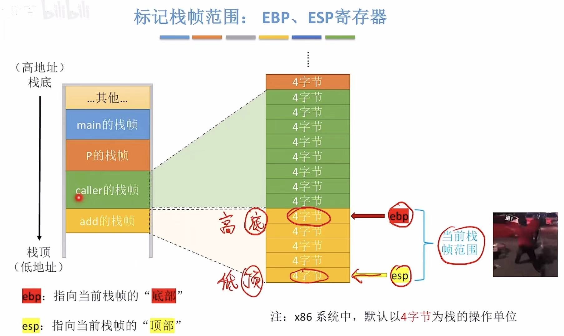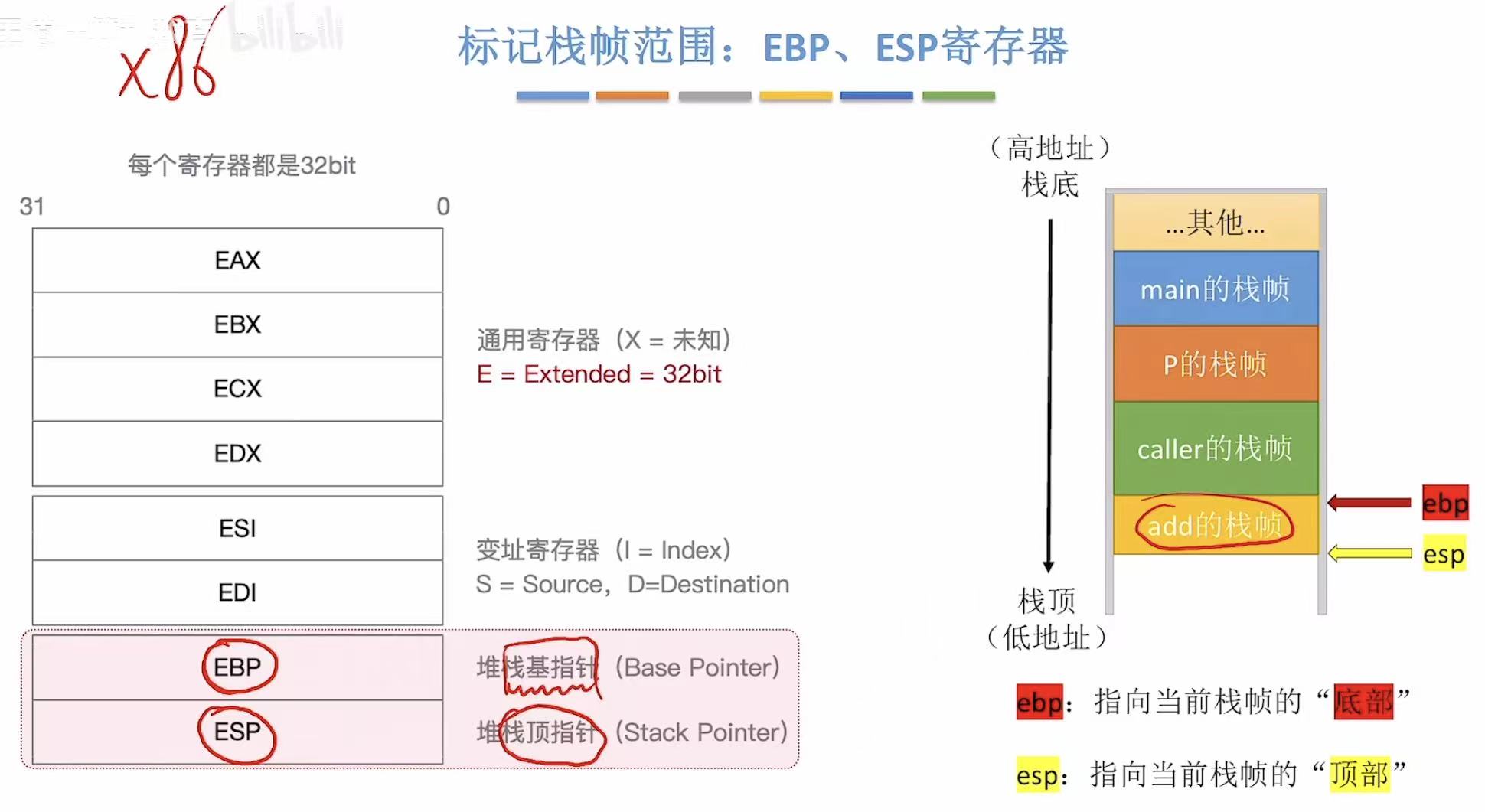 简单记:EBP-->栈底指针;ESP-->栈顶指针