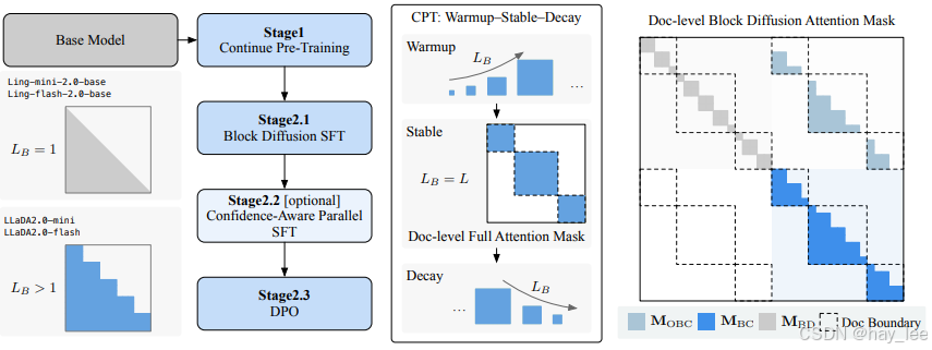 LLaDA2.0 无需代价高昂的从头训练,而是秉持知识继承、渐进式适应与效率优先的设计原则,利用一种新颖的三阶段、基于块级权重空间分解(WSD)的训练方案,将预训练的 AR 模型无缝转换为 dLLM:第一阶段为块扩散中的块尺寸逐步增大(预热阶段),第二阶段为大规模全序列扩散(稳定阶段),第三阶段则回退至紧凑块尺寸的扩散(衰减阶段)。结合后续基于监督微调(SFT)和直接偏好优化(DPO)的对齐训练,我们得到了两个面向实际部署优化的指令微调版混合专家(MoE)模型:LLaDA2.0-mini(160 亿参数)和 LLaDA2.0-flash(1000 亿参数)。这些模型保留了并行解码的优势,在前沿规模下实现了卓越的性能与效率。两个模型均已开源。