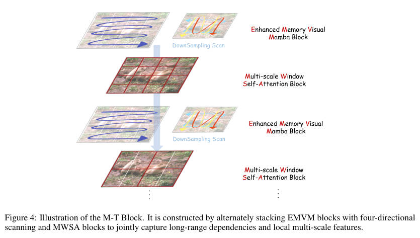 - 增强记忆视觉 Mamba (EMVM):针对 Mamba 的遗忘问题,设计了基于下采样和四向扫描的改进模块,显著减少了计算冗余并增强了长序列的记忆能力。